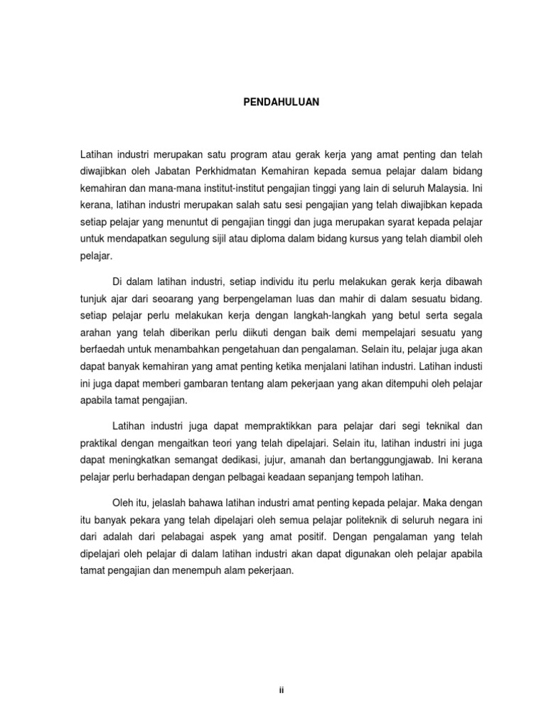 Pengenalan 11 pendahuluan 1 12 objektif latihan industri 1 13 objektif laporan 2 14 kepentingan latihan industri kepada pelajar 2 bab 2. Up to 24 cash back PENGENALAN Latihan Industri merupakan antara syarat-syarat yang telah diperuntukkan ke atas setiap pelajar di seluruh Politeknik di Malaysia khususnya. Bagi sesi DISEMBER 2017 latihan ini berjalan selama 20 minggu iaitu bermula pada 27 NOVEMBER 2017 hingga 13 APRIL 2018.